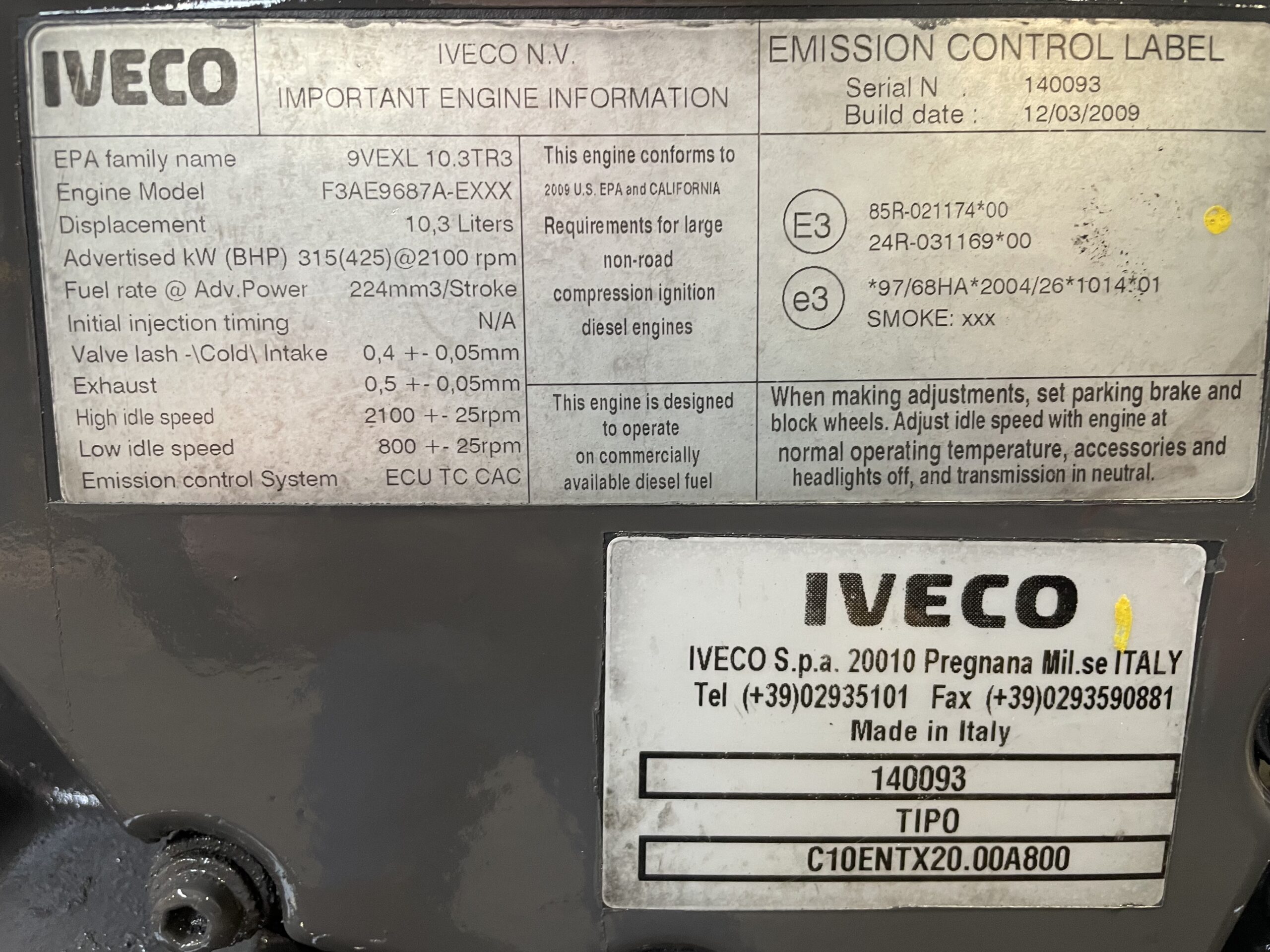 Iveco 10.3L motor med familie kode 9VEXL10.3TR3, kører godt.